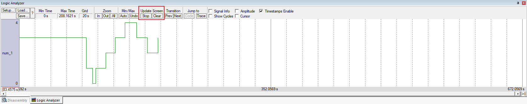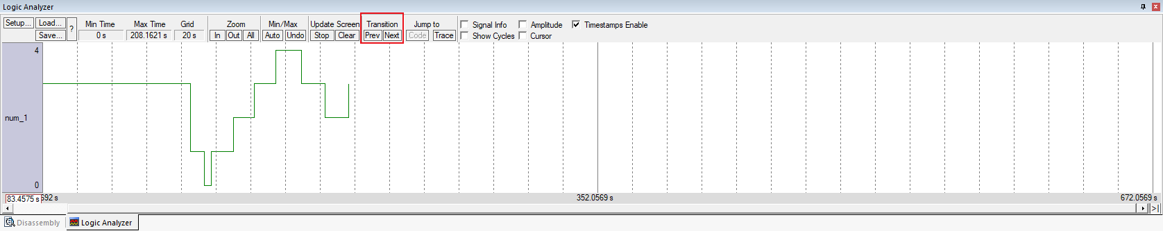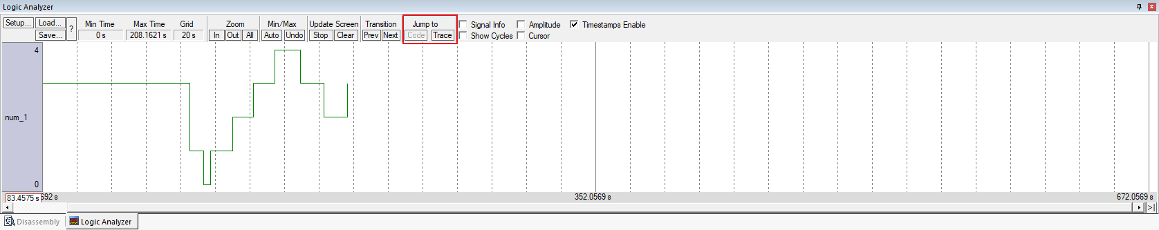 a) Code:打開(kāi)導(dǎo)致信號(hào)轉(zhuǎn)換的代碼行處的反匯編或源代碼窗口。當(dāng)程序計(jì)數(shù)器值被記錄時(shí),該按鈕處于活動(dòng)狀態(tài)。