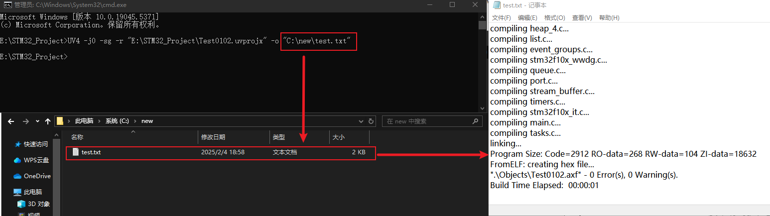 UV4 -r "E:18、文檔預(yù)研新建文件夾STM32_ProjectTest0102.uvprojx" -o "C:newtest.txt"