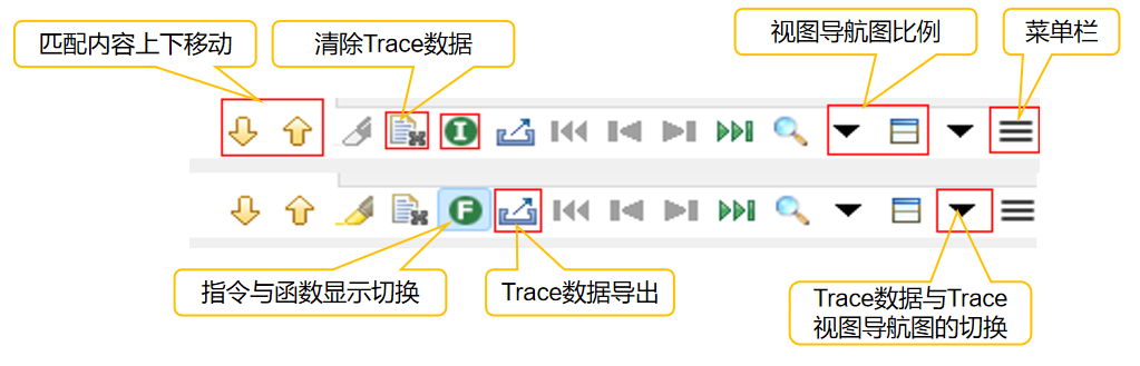 2. 指令與函數(shù)顯示切換按鈕,當(dāng)選為“I”,Trace數(shù)據(jù)呈現(xiàn)指令,當(dāng)選為“F”,Trace數(shù)據(jù)呈現(xiàn)函數(shù)名稱,如圖3-4所示: