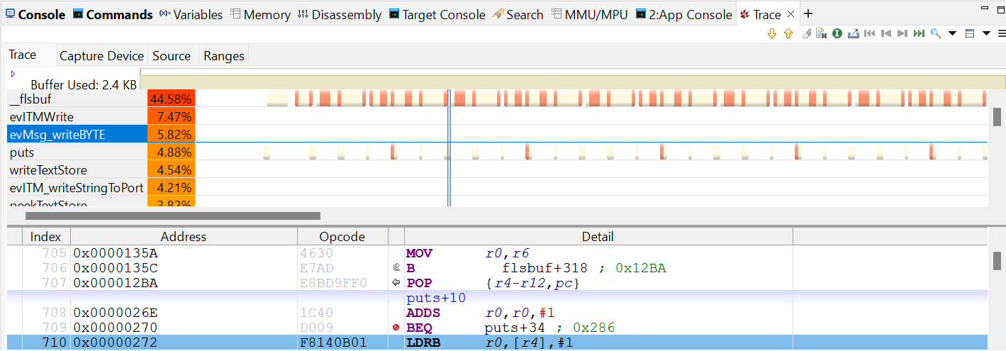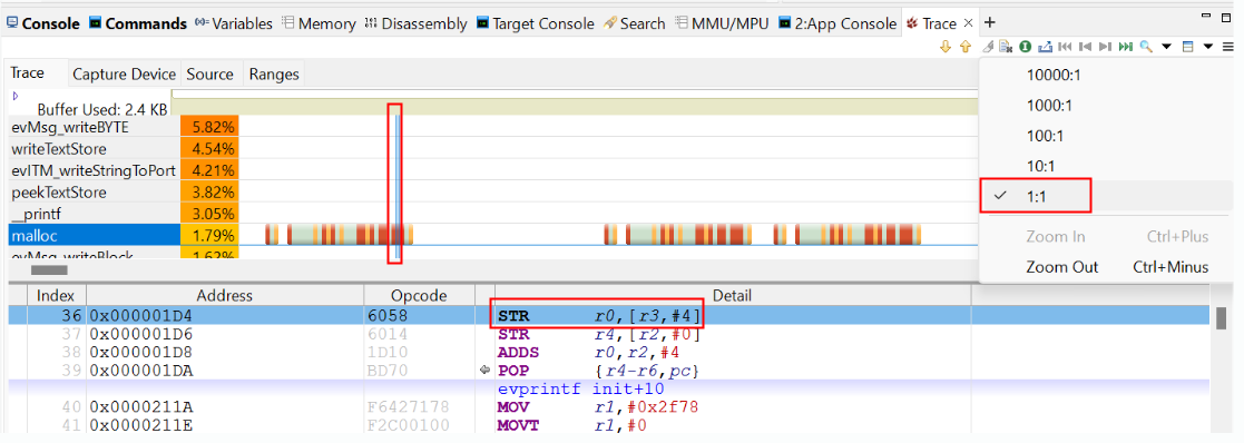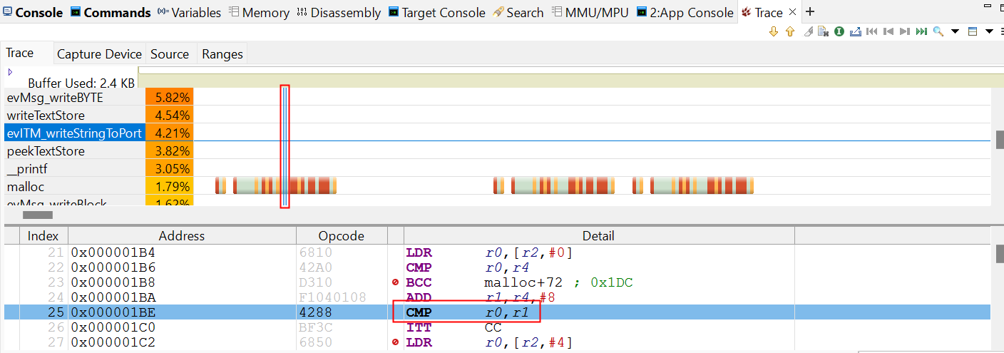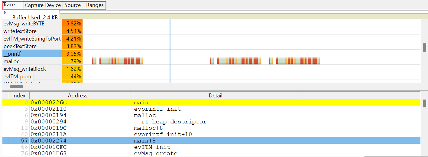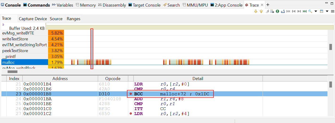 ● Trace標(biāo)簽頁顯示圖形時間線和反匯編代碼。