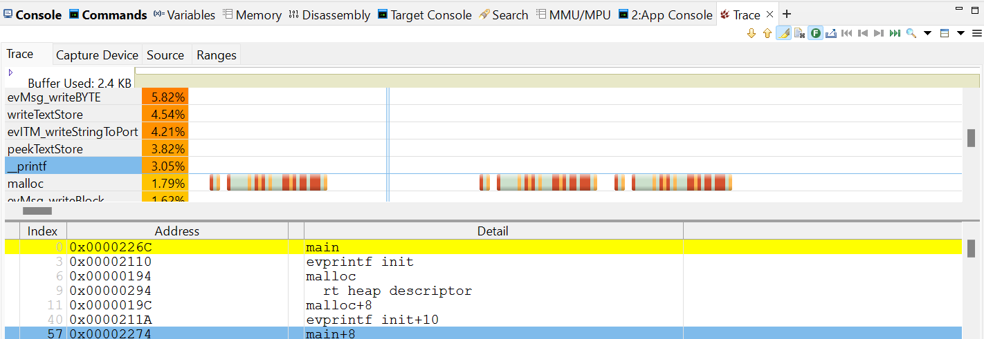 3. Trace視圖導(dǎo)航圖中數(shù)據(jù)的說明,百分比數(shù)據(jù)是指該函數(shù)的指令點總的指令數(shù)的百分比。在導(dǎo)航時間線上,當(dāng)縮放比例是1:1時,深紅色表示訪問內(nèi)存的指令,橙色表示分支指令,淺綠色表示其個指令,如圖3-5所示: