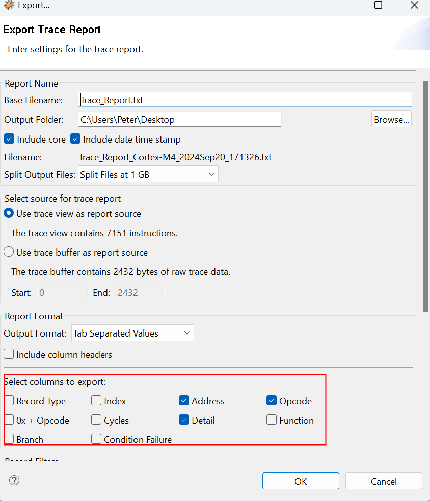 5. 導(dǎo)出的Trace數(shù)據(jù)文件是一個文本文件,默認(rèn)情況下文件的內(nèi)容與Trace視圖導(dǎo)航圖下部分的內(nèi)容相同;導(dǎo)出Trace窗體中可以對導(dǎo)出的Trace數(shù)據(jù)進(jìn)行設(shè)置,如圖3-7所示: