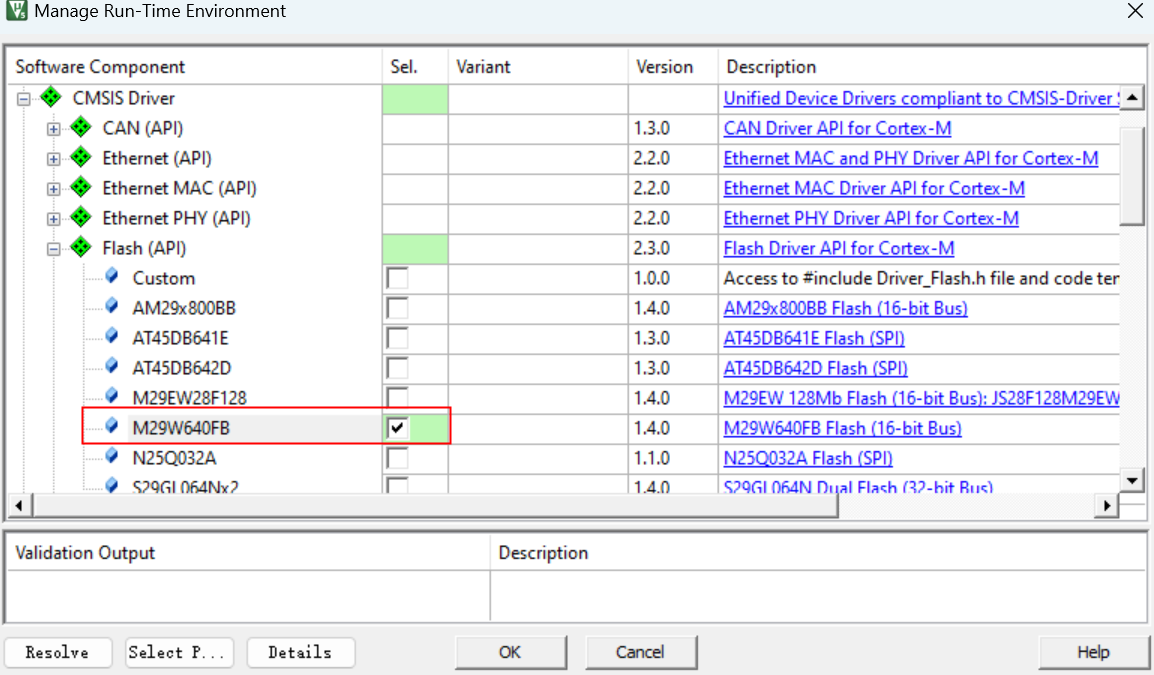 4. 選擇“CMSIS?Driver-->Flash-->M29W640FB”,如圖3-4所示: