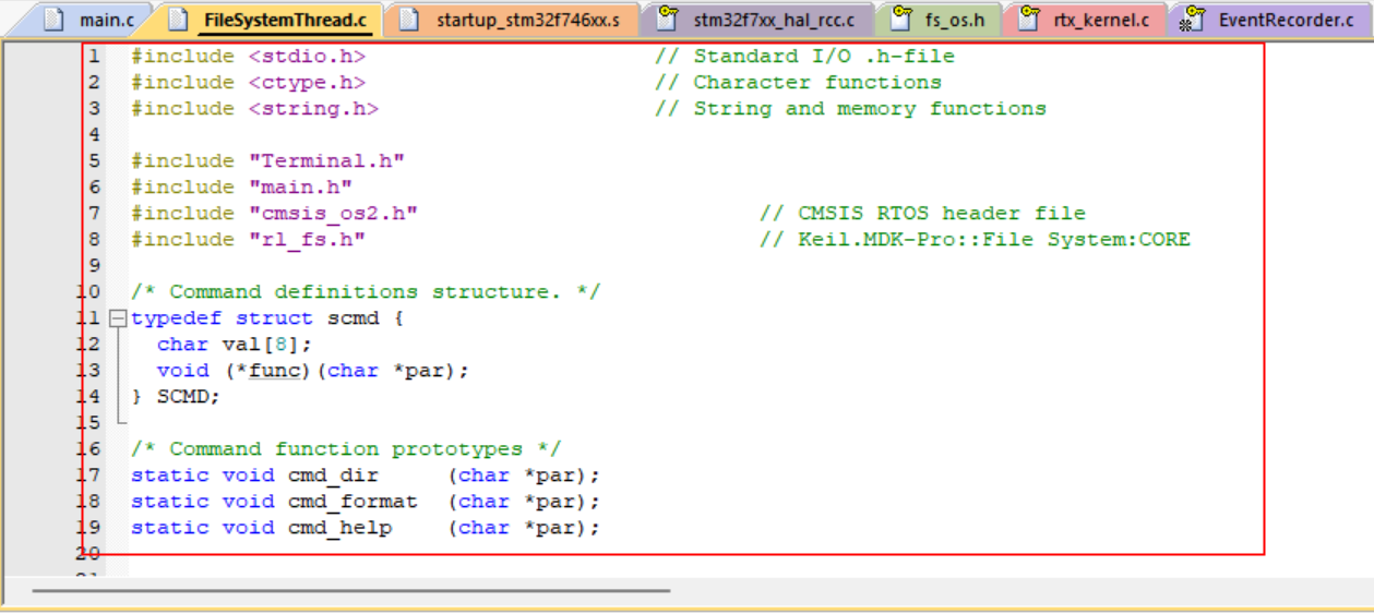 12. 打開“FileSystemThread.c”文件,添加與文件系統(tǒng)操作相關(guān)的代碼(由于代碼過多,參考實(shí)例代碼),如圖3-12所示: