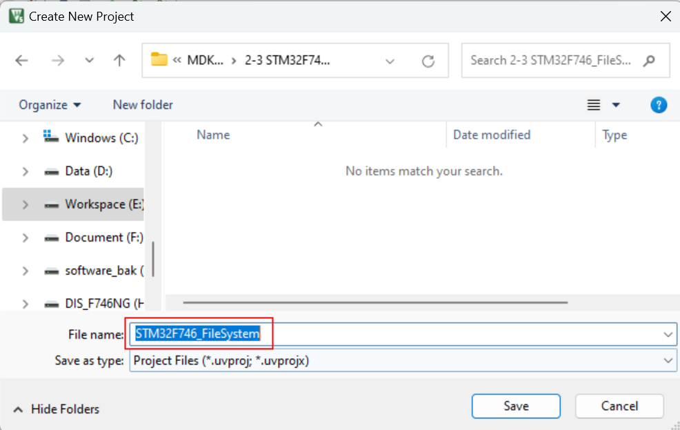 1. 打開uVision,創建一個名稱為:STM32F746_FileSystem的項目,如圖3-1所示: