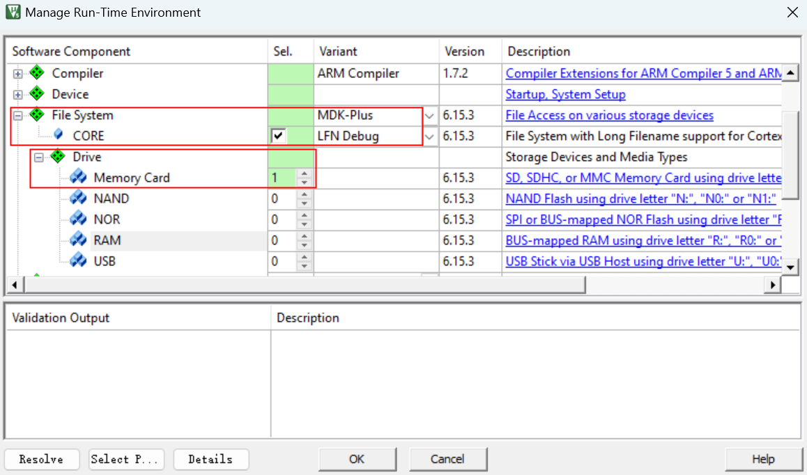 6. 選擇“File System-->CORE”,并設置“File System-->Drive-->Memory Card”組件,點擊“Resolve”完成相關組件的添加,如圖3-6所示:
