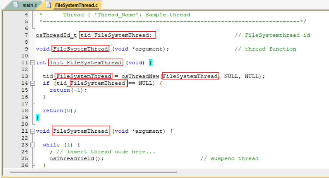 12. 打開“FileSystemThread.c”文件,添加與文件系統操作相關的代碼(由于代碼過多,參考實例代碼),如圖3-12所示: