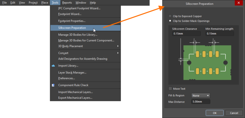 菜單欄下打開:【Tools】→【Silkscreen Preparation】,將絲印制備對話框打開。