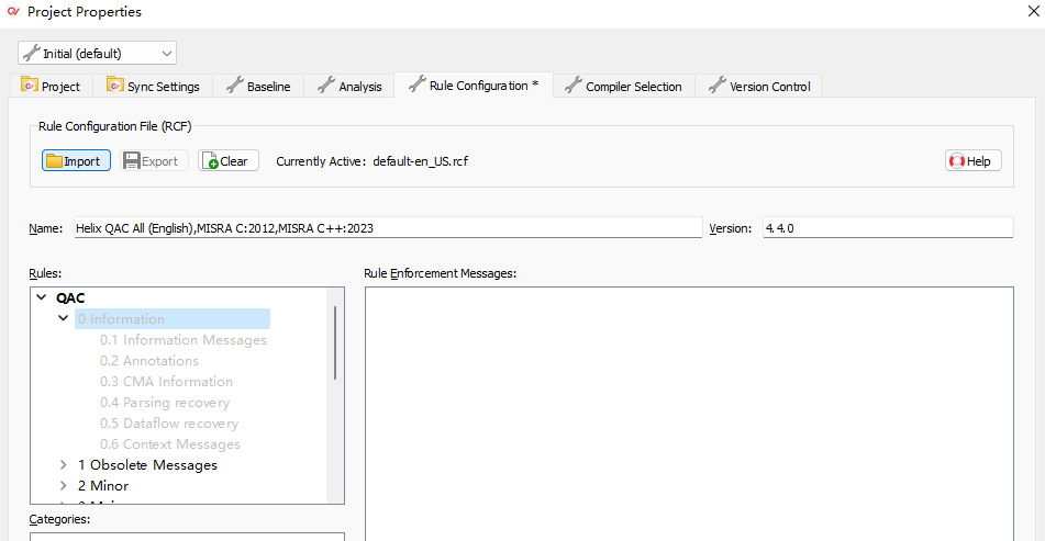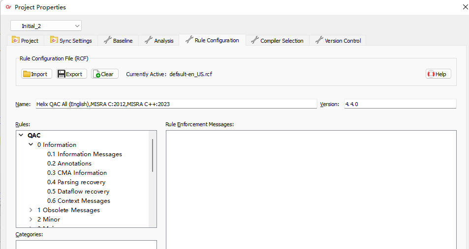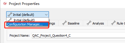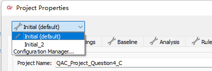 4)、然后,就可以在Project Properties窗口的左上角去切換屬性的配置方案(如圖4-4-1)。兩個(gè)配置方案的相關(guān)配置更改不會(huì)影響另外一個(gè)配置方案。如圖4-4-2中所示,在Initial方案中禁用了QAC規(guī)則的第0等級(jí)規(guī)則。而如圖4-4-3中所示,在Initial_2方案中是沒(méi)有被禁用的。