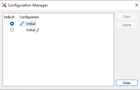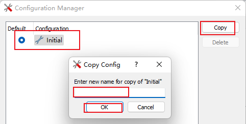 3)、打開(kāi)Configuration Manager窗口后,可以看到目前只有一個(gè)Initial一個(gè)工程屬性配置方案。可以通過(guò)點(diǎn)擊Initial,然后,點(diǎn)擊Copy。就會(huì)出現(xiàn)Copy Config的窗口,在這里輸入新的工程屬性配置方案的名字,例如Initial_2,就會(huì)將Initial方案復(fù)制生成Initial_2方案。(如圖4-3-1和圖4-3-2)