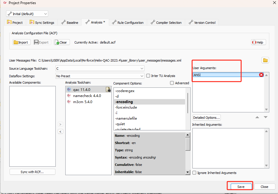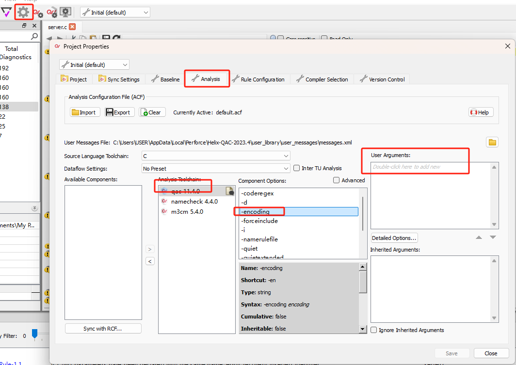 1)、點(diǎn)擊工程屬性配置按鈕,進(jìn)入到Project Properties窗口中,切換到Analysis欄中。然后,在Analysis Toolchain中選擇QAC工具鏈(例如圖4-1中的qac 11.4.0)。選中后在Component Options中選擇-encoding。最后,在User Arguments欄中雙擊,最后輸入?yún)?shù)“ANSI”即可。