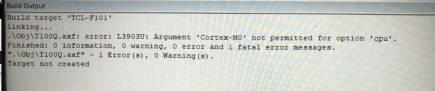 電腦或者軟件因為意外情況導致崩潰,無法正常關閉,強制電腦重啟之后,打開工程去編譯出現下面的報錯信息(如圖2-1)。報錯信息為:"error: L3903U: Argument 'Cortex-M0' not permitted for option 'cpu'."