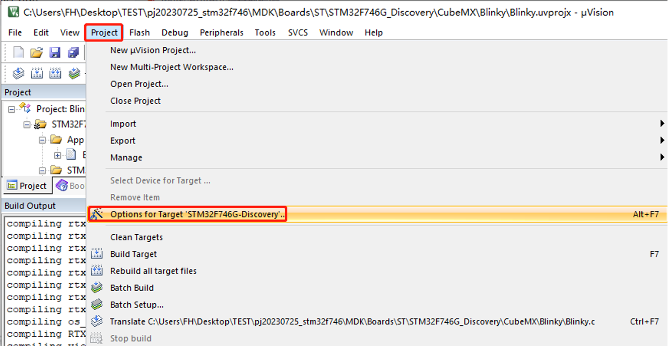 1、在菜單點擊“Project”-->“Options for Target ‘ Project name ’…”。