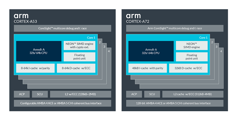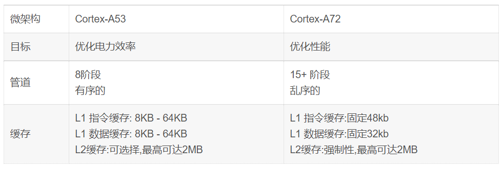 例如,Cortex-A53和Cortex-A72都是Armv8-A架構(gòu)的實現(xiàn)。這意味著它們具有相同的架構(gòu),但它們具有不同的微架構(gòu)。如下圖和表所示: