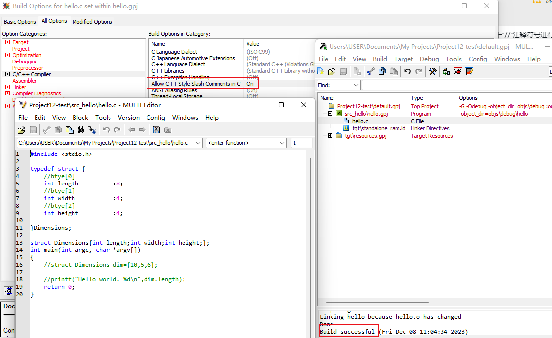 2)第二種情況是由于GHS的配置導致的。在build options中有C/C++ Compiler->Allow C++ Style Slash Comments in C的一個配置選項。這個配置選項就是對于C++的注釋風格是否兼容進行配置。(如圖4-2)