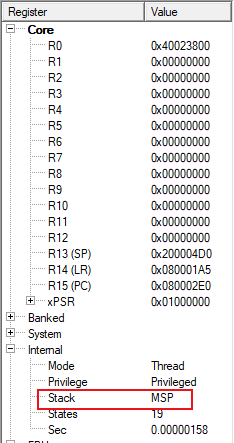 2)、當程序停止到斷點處后,通過Register窗口中Internal的Stack確認堆棧指針類型是什么?圖4-2顯示的就是MSP。