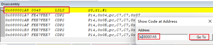 5)、然后,在Disassembly窗口中,右鍵打開菜單找到Show Disassembly at Address(如圖4-5-1),在打開的Show code at Address窗口中以0x為開頭的方式輸入在Memory1中確認的地址信息(如圖4-5-2),然后,就可以跳轉到對應的代碼位置。然后,根據跳轉的代碼位置去確認堆棧溢出的位置即可。