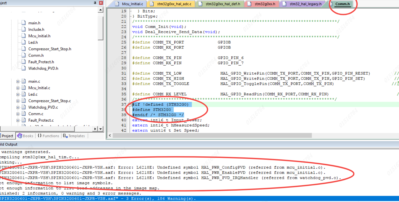 定義在STM32G0xx .h中的函數,它總是包含在基于STM32G0xx設備的項目中并使用。將STM32G0xx .h修改部分還原,并且將其文件格式設置為可讀即可,如圖4-1在Comm.h文件并進行宏定義,而后編譯出現錯誤,符合檢查動態(tài)語法規(guī)則。
