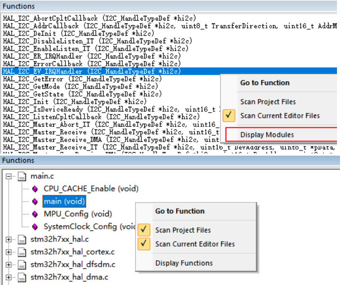 2)、右鍵點擊<Functions>界面,點擊“Display Modules”恢復(fù)文件形式查看,選擇“Scan Project Files”和“Scan Current Editor Files",分別掃描項目文件和編譯器文件。點擊“Go to Function”或雙擊可以跳轉(zhuǎn)到該函數(shù)。