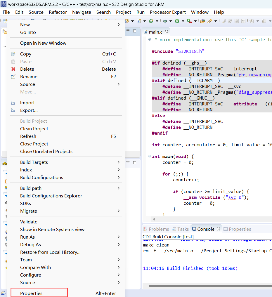 1)、打開S32DS,選中項(xiàng)目點(diǎn)擊右鍵,選中“Properties”,進(jìn)入設(shè)置界面。