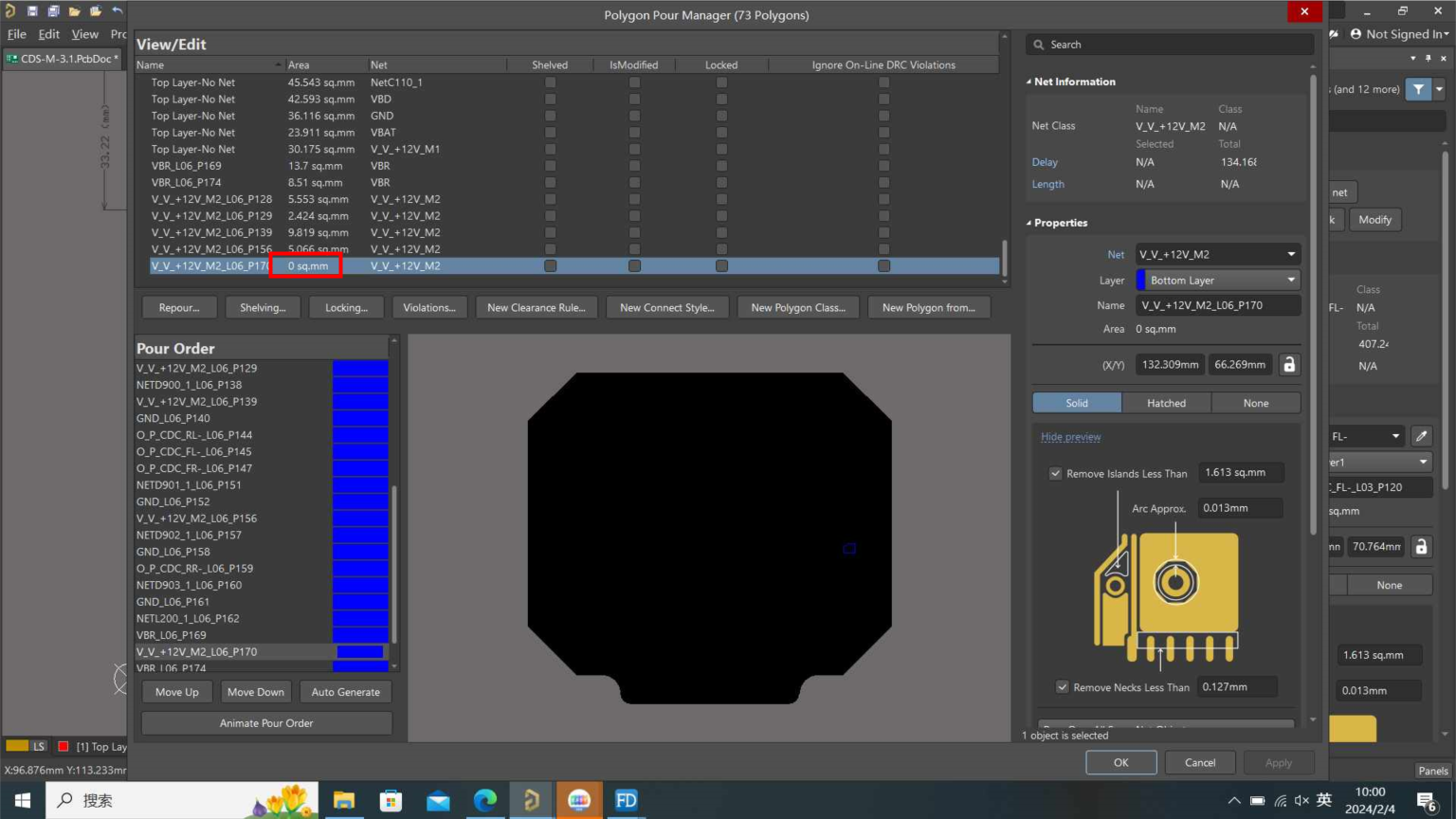 打開敷銅管理器,可以看到有些小塊敷銅的面積為 0,沒有成功敷銅。