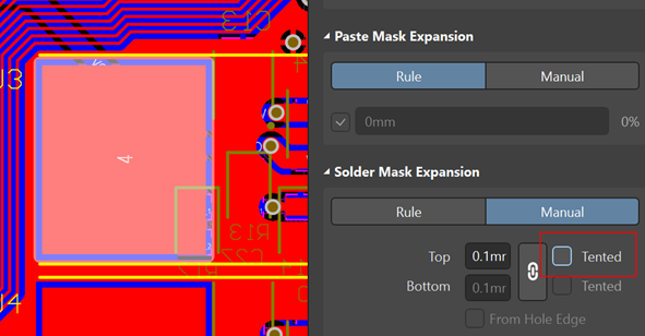 1)、 焊盤的屬性中可以設置蓋油或者不蓋油,見圖1,最直接的修改方法,就是去勾選Tented,勾選為蓋油,不勾選則為不蓋油。當發現焊盤被蓋油時,取消勾選Tented就可以去除油。