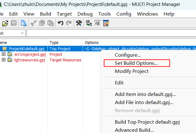 1)、進入項目管理界面,選擇項目”Top Project“右鍵,選擇"Set Build Options"
