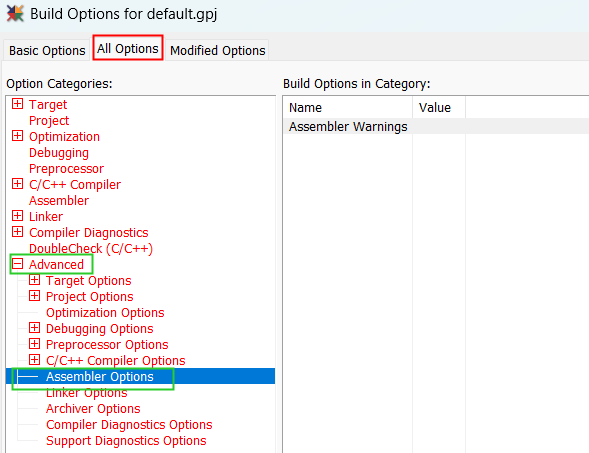 2)、進入”Build Options for default.gpj“,選擇“Advanced”-->“Assembler Options”。