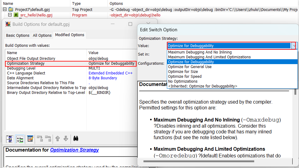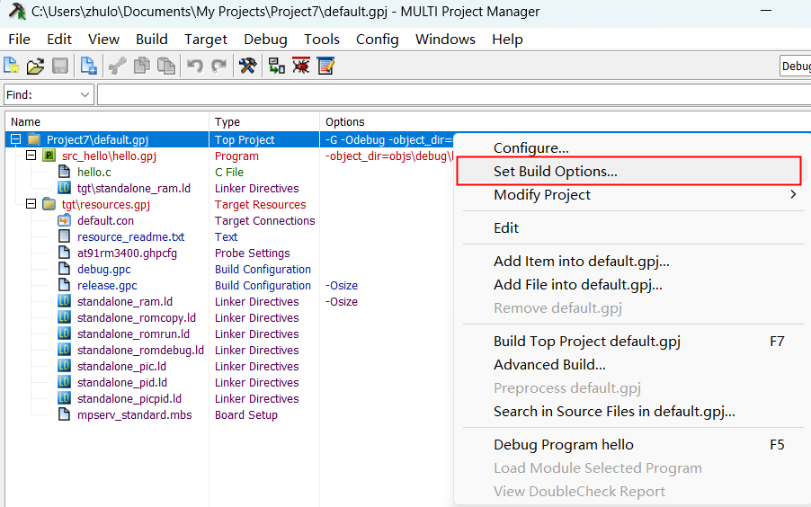1)、進入項目的設置內,選擇project后右鍵選擇“Set Build Options...”,設置整個項目的優化等級,例如下圖我們設置為-Odebug模式。