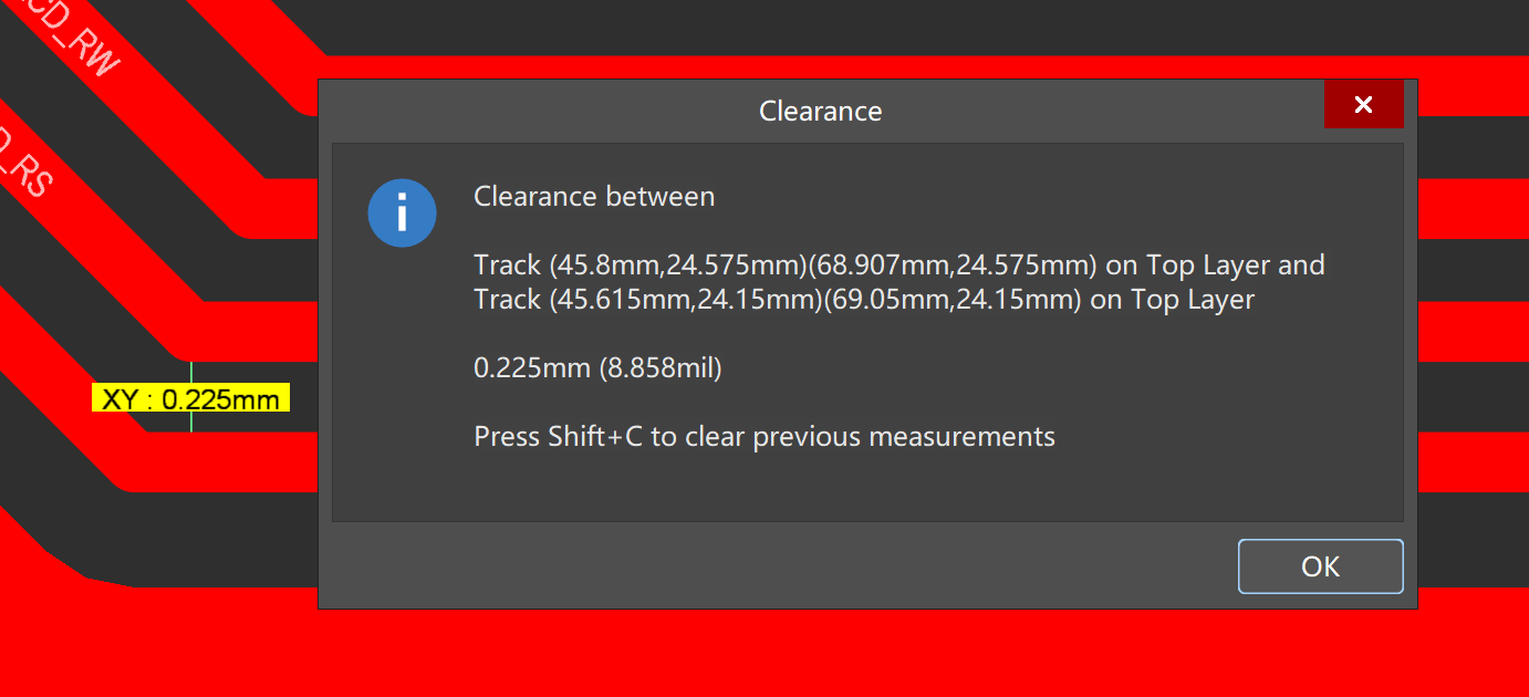 測(cè)量選中對(duì)象邊緣到邊緣的距離,圖4為測(cè)量焊盤到焊盤的邊緣距離,圖5為測(cè)量線到線的邊緣距離。