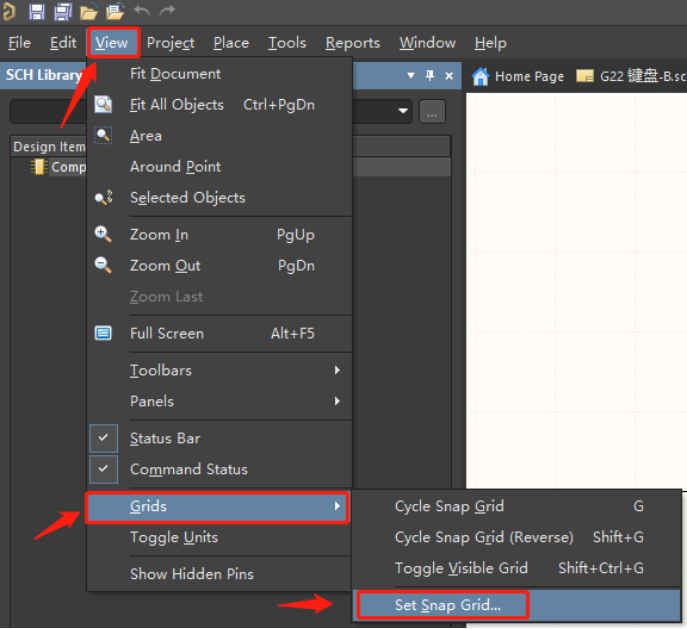 在原理圖庫編輯界面按快捷鍵G,可在10mil/50mil/100mil之間循環切換。