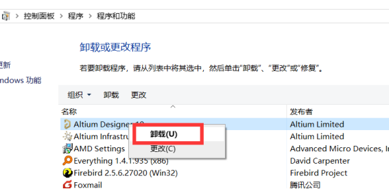 在電腦控制面板找到對應的Altium?Designer軟件程序,鼠標右鍵選擇卸載,如下: