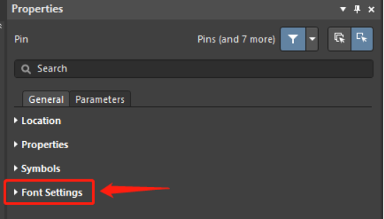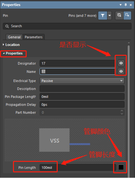 在原理圖庫(kù)編輯界面雙擊需要設(shè)置的引腳或者在放置引腳的狀態(tài)下按Tab鍵;在彈出的Properties面板中設(shè)置引腳的參數(shù)。