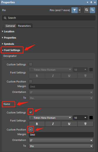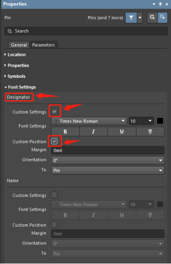 在Name下勾選勾選Custom Position復(fù)選框,并在下方的Margin進(jìn)行填寫(xiě)距離管腳的距離,Orientation文字的朝向,To管腳/器件;