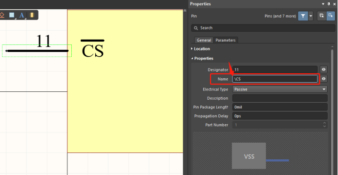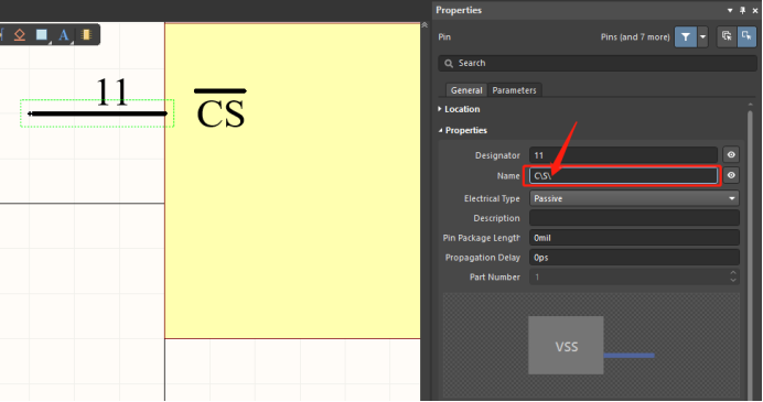 在原理圖庫編輯界面雙擊需要設置的引腳或者在放置引腳的狀態下按Tab鍵;在彈出的Properties面板中,Name文本框內,在字符串的最前面加上一個反斜杠“”,這樣就可以實現在整個管腳名稱上增加上劃線。