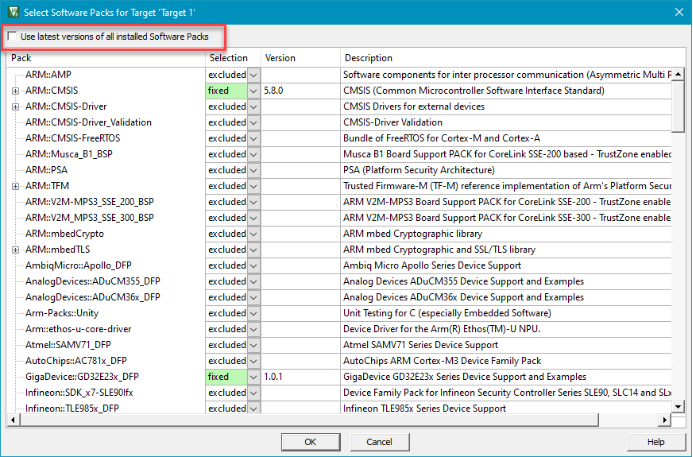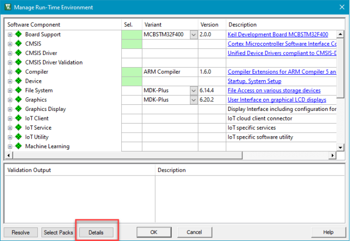 - 使用相同版本的軟件包。獲得顯示項目中使用的所有軟件包的詳細列表的方法,例如設備系列包?(DFP)、CMSIS、MDK中間件包等,是在uVision中打開“管理運行時環境”對話框并單擊“詳細信息”,如以下屏幕截圖所示。將在包含此類列表的同一項目文件夾中生成Packs_*.htm文件。對于缺少此“詳細信息”按鈕的舊MDK uVision v5.x版本,打開構建日志文件還可以為您提供項目中使用的所有軟件包的詳細列表。