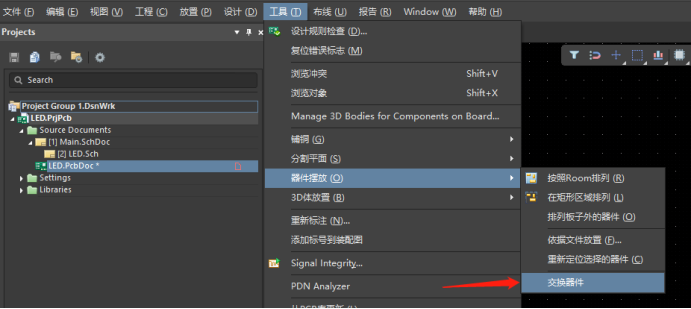 執(zhí)行菜單欄中的“工具”--> “器件擺放”-->“交換器件”,即可實(shí)現(xiàn)元件的交換。