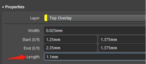 在絲印層繪制線時,可以任意放置一根線,然后通過修改Start(X/Y)和End(X/Y)的數(shù)值來得到線條的長度。