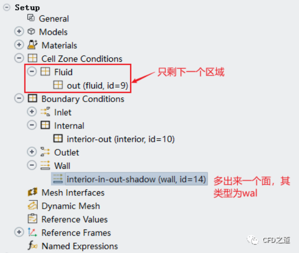 刪除完畢后計算區域中只剩下out區域,且原來的內部面自動修改為wall類型的邊界,如下圖所示。
