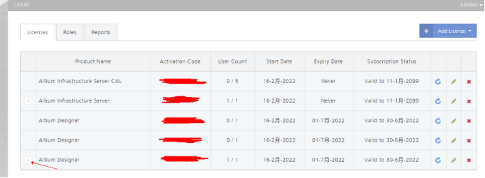 2. 點(diǎn)擊需要釋放的License左側(cè)的【+】,展開樹狀結(jié)構(gòu)