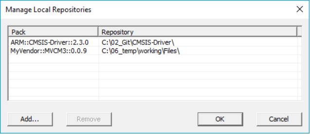 已安裝包的所有版本都存儲在包根文件夾下(默認(rèn)值:%localappdata%ArmPacks)。在開發(fā)軟件包時(shí),直接訪問其內(nèi)容而不需要在修改后重新構(gòu)建和重新安裝軟件包是很有用的。為此,您可以通過選擇File - Manage Local Repositories... 并按Add...來添加包的本地副本的文件夾。選擇文件夾中的 PDSC 文件,然后按 OK: