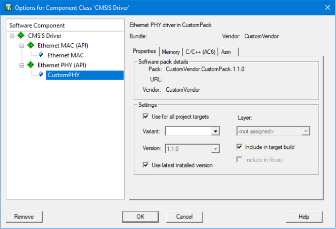 在我們的示例中,CustomPack 提供以太網 PHY 實現,因此選擇 CustomPHY 組件會將文件 CustomPHY.c添加到項目窗口中的軟件組件類CMSIS Driver。