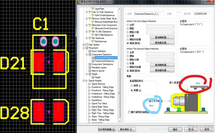 封裝重疊,Design---rules---找到placement---component clearance,設置為0mil 0 mil
