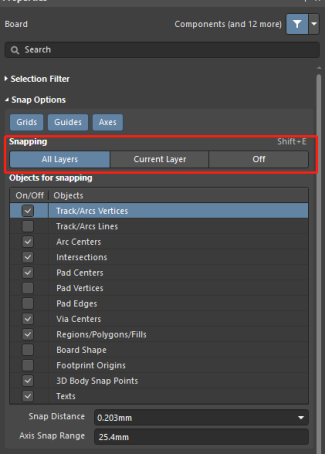 用于切換設(shè)計對象的捕捉啟用方式,All Layers(所有層)Current Layer(僅當(dāng)前層)Off(關(guān)閉捕捉),也可以通過Shift+E切換;