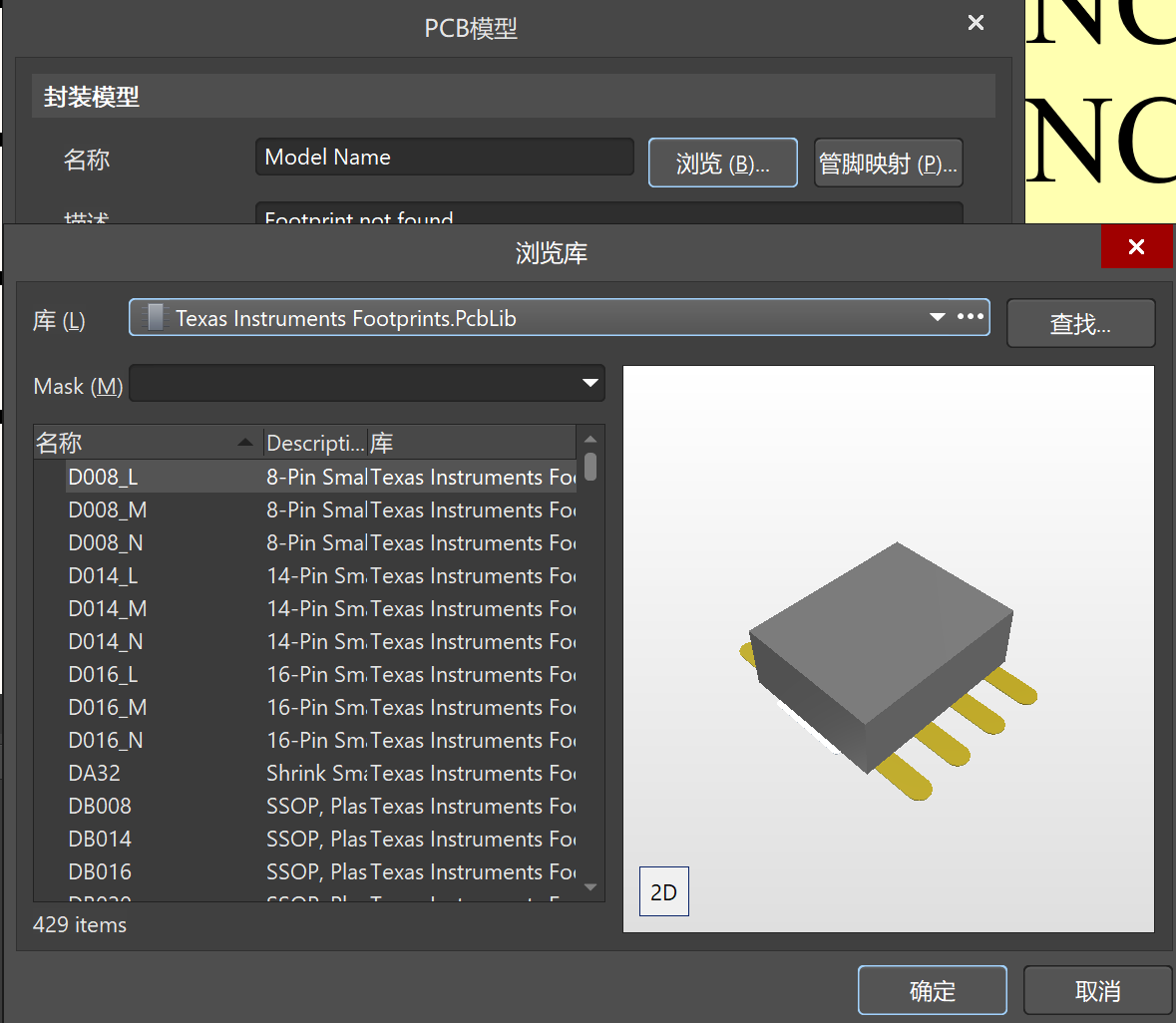 3. 點擊【瀏覽】,打開“瀏覽庫”窗口,找到對應(yīng)的PCB庫文件,選擇對應(yīng)的封裝