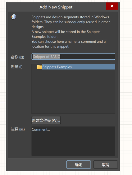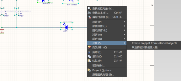 在確定好保存文件夾后,關閉該對話框,在原理圖中選中想要摘錄出來的部分電路,然后鼠標右鍵,選擇【片段】,會出現兩條指令(Create Snippet from selected objects和從選擇的對象創建片段),實測下來,兩跳指令除了打開的對話框不同之外,實現的功能是相同的。