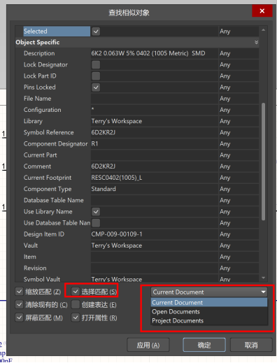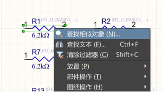 以原理圖編輯為例,把電阻值6.2K改成10K,首先選中一個需要修改的元器件,然后鼠標(biāo)右鍵,選擇【查找相似對象】,打開對話框。在該對話框中,可以根據(jù)需要選擇對應(yīng)的條件來實現(xiàn)相似對象的過濾、選擇,以保證把需要修改的元器件都選中。下方有一個“選擇匹配”框需要勾選一下,如果不勾選,在查找出所有相似對象后,不會自動把這些元器件都選中,需要使用快捷鍵Ctrl+A來做一個全選的指令把它們都選中。勾選了這個“選擇匹配”之后,軟件就會自動把匹配出的相似對象全部選中。在“Document”下拉框中,可以選擇當(dāng)前圖紙/打開的圖紙/項目中所有圖紙。