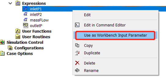 在expressions下右鍵單擊inletP1,然后選擇“Use as Workbench Input Parameter”,如下圖所示。定義完成后在這個(gè)參數(shù)前出現(xiàn)一個(gè)“→P”右箭頭和P字母,表示設(shè)置完成。在WorkBench下就可以看到該參數(shù)。