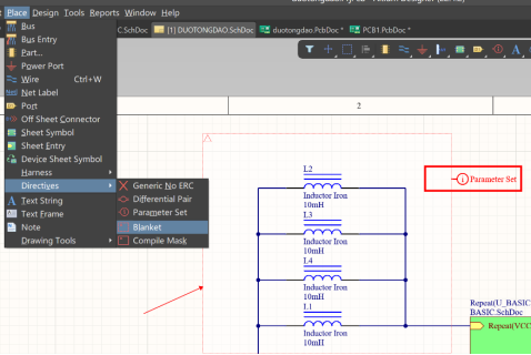 1. 執(zhí)行菜單“Place”—“Directives”—“Blanket”,將需要單獨設置的電路部分框在區(qū)域內(nèi)。
