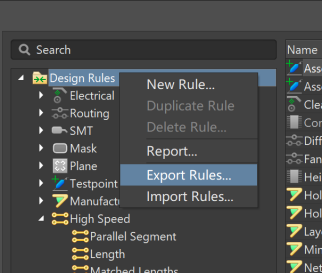 1. 打開PCB規則及約束編輯器,在左邊規則項區域內右擊,在彈出的菜單中執行Export Rules